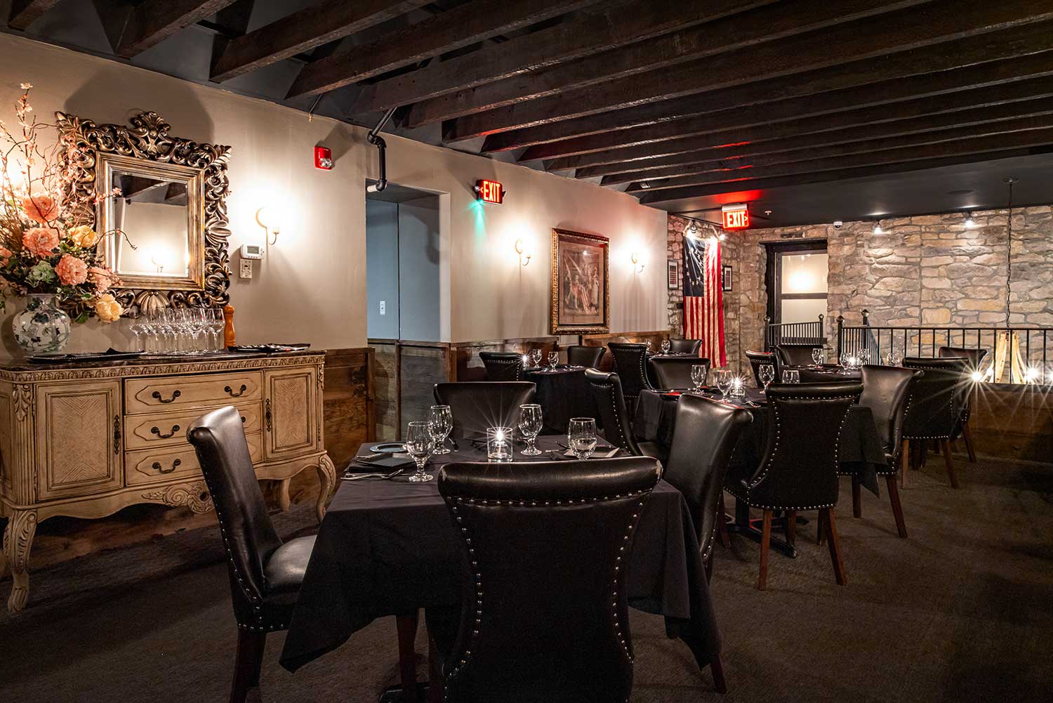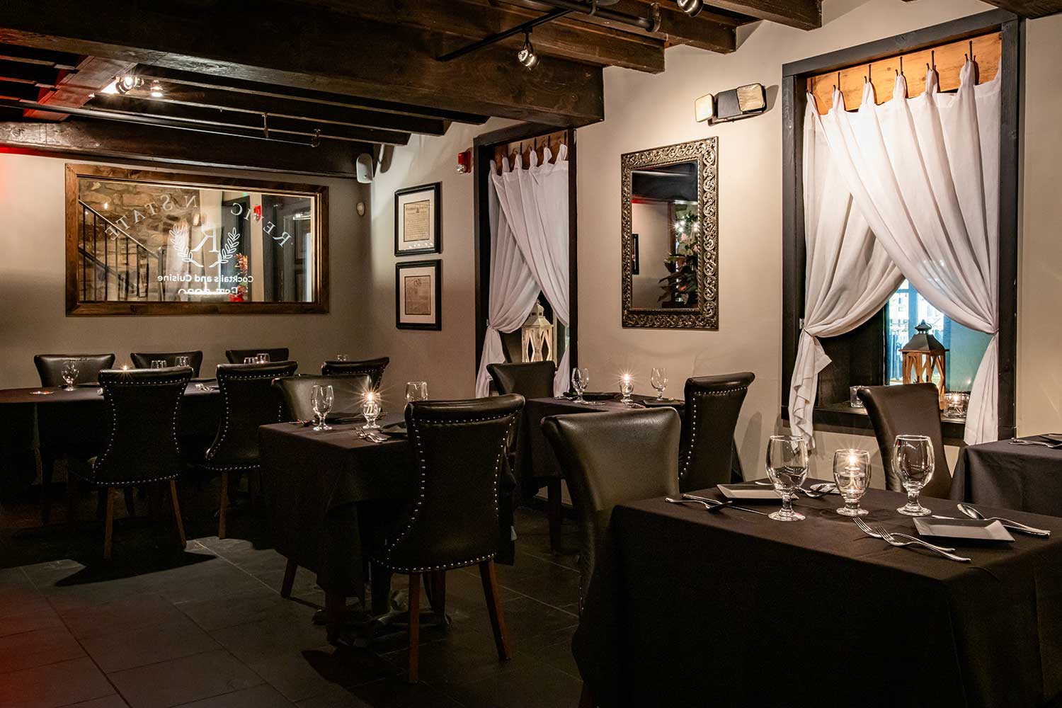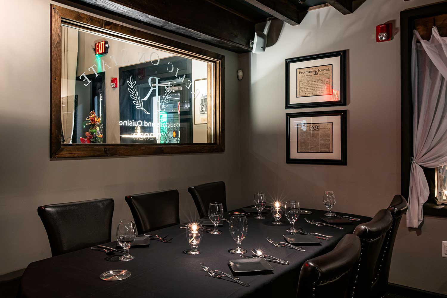 Our space can accommodate almost any size party with our two level dining room, private conservatory, and private bar. This flexibility makes it a great choice for either a full-restaurant cocktail party of 100 guests, seated dinner for up to 75, or a private corporate dinner for as few as 6 people.